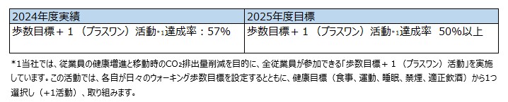 2023年度からは、個人毎に歩数目標を設定して、年間を通して従業員が参加し易い活動に取り組みはじめました。併せて部門単位でも歩数達成率を設定することで全社活動としています。この取組みの参加率は約80%と高い参加率となっています。